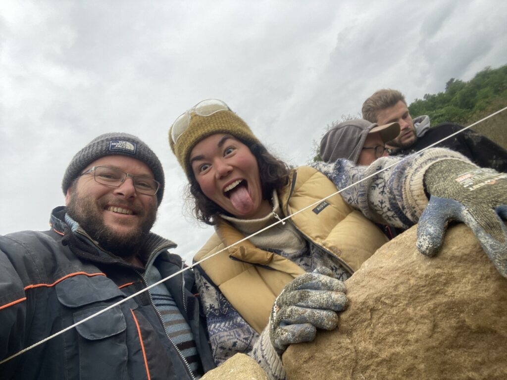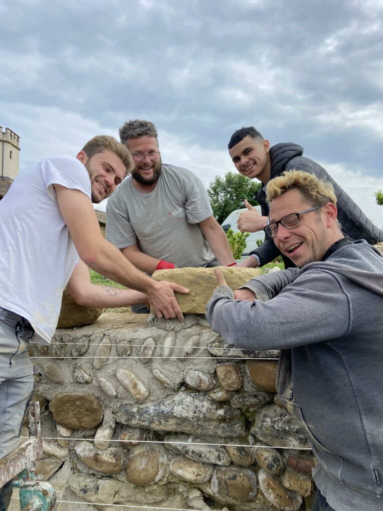 Nous apprendrons à tirer des cordeaux, faire des mortiers et des bétons de chaux, des bétons cyclopéens, du drainage de pied de mur et surtout nous tenterons de redonner son âme d’antan à ce mur bien mal en point.