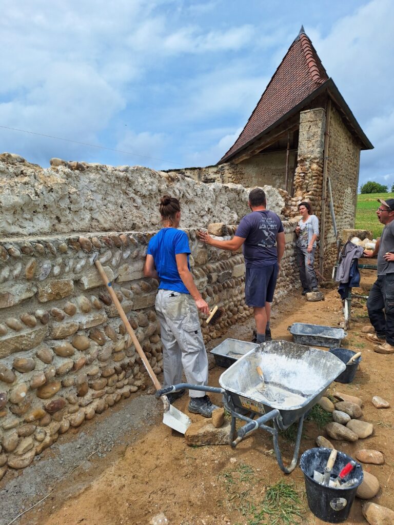 L’objectif de nos deux sessions printanières sera de continuer la restauration du mur nord, entamée l’an dernier. Le chantier proposera un atelier taille de pierre lors duquel nous façonnerons des moellons de molasses à partir d’un stock conséquent de pierres de récupération. Nous maçonnerons ensuite à la chaux les pierres et galets en différents endroits du mur, qui ne connaît pas les mêmes pathologies le long de ses 40 mètres à restaurer.