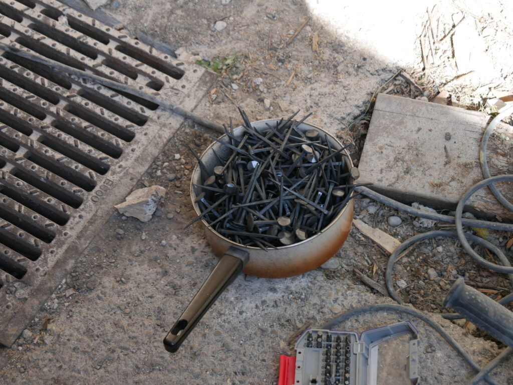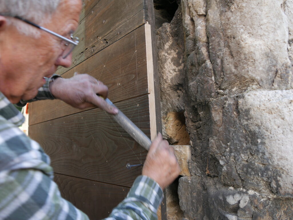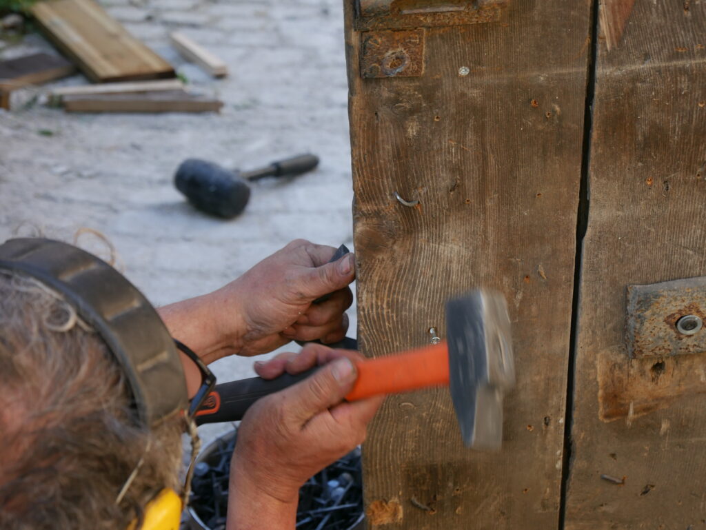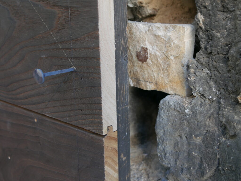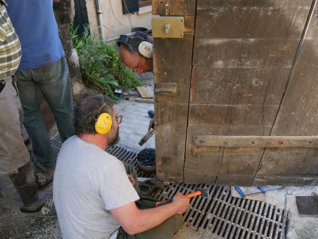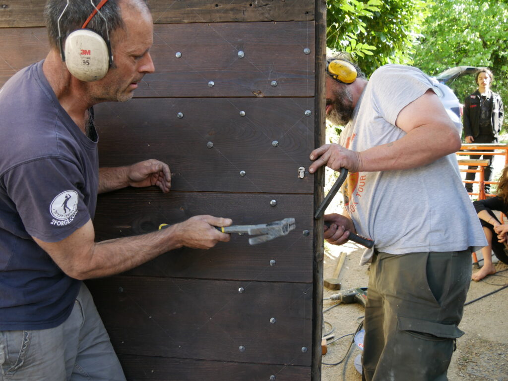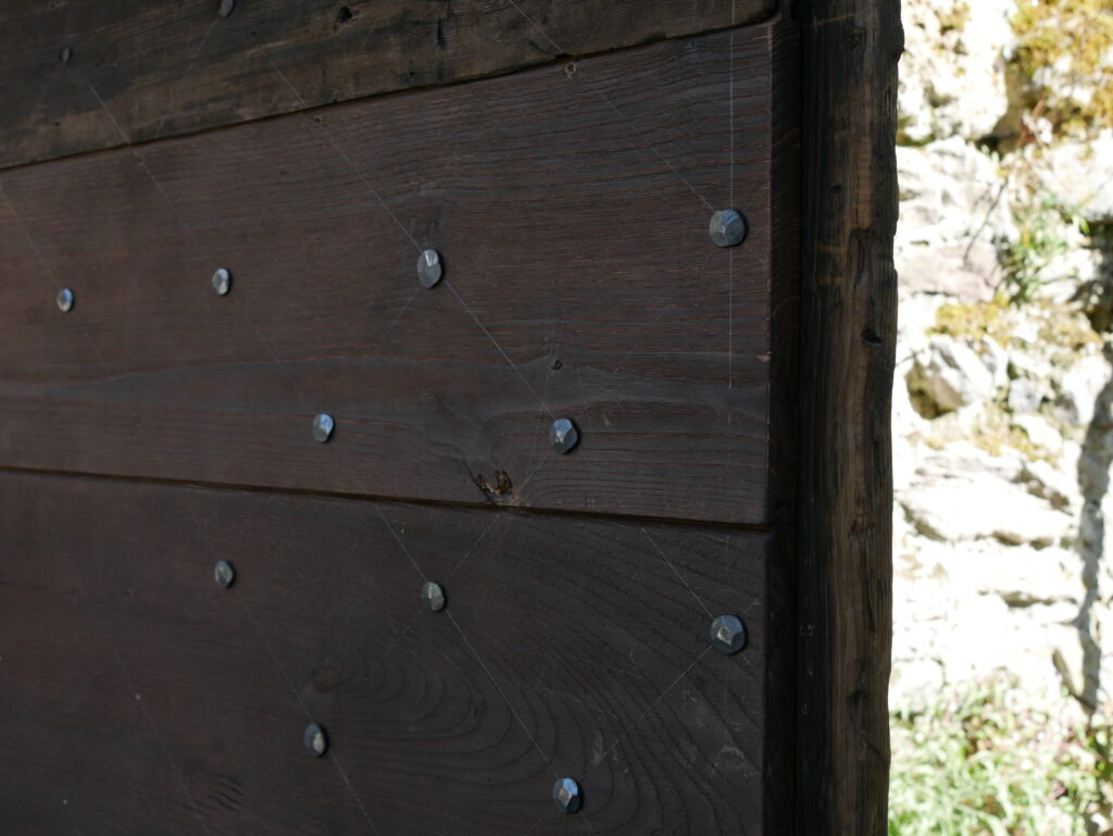 Dans ce procédé, la pose des clous se fait toujours de la même manière (cas de ces ouvrages menuisés médiévaux, souvent à vocation militaire) : les planches horizontales sont clouées sur les verticales grâce à des clous forgés, les pointes des clous sont recourbées et rentrées au marteau dans les planches verticales du dos de la porte. Les têtes de clous ainsi que les parties horizontales en bois font alors face à l’extérieur, pour des raisons vraisemblablement défensives : les portes armées de têtes de clous sont ainsi plus robustes. Peu de matériaux sont utilisés pour leur fabrication et ces derniers proviennent tous des environs proches.