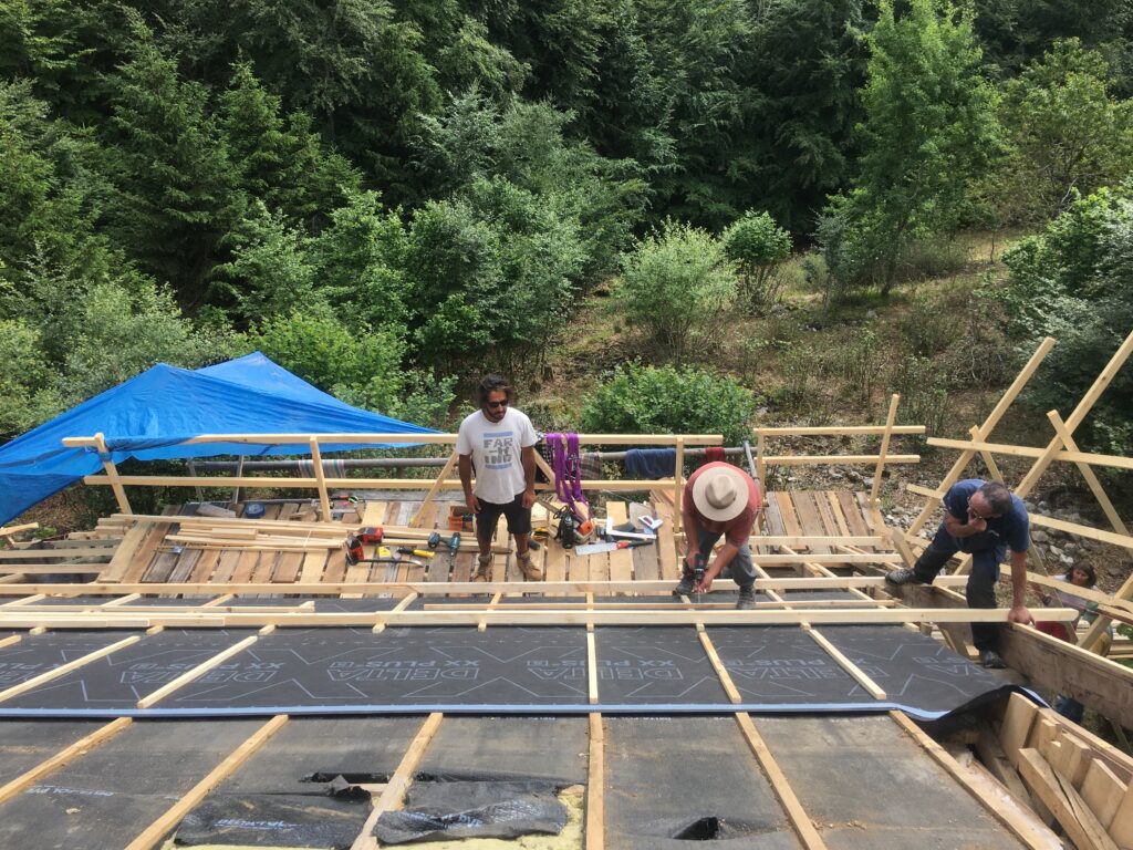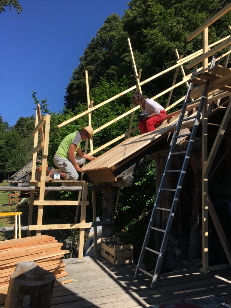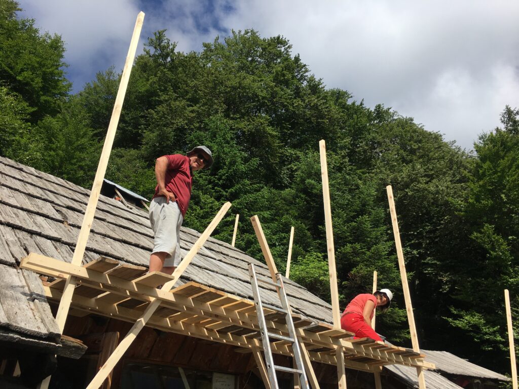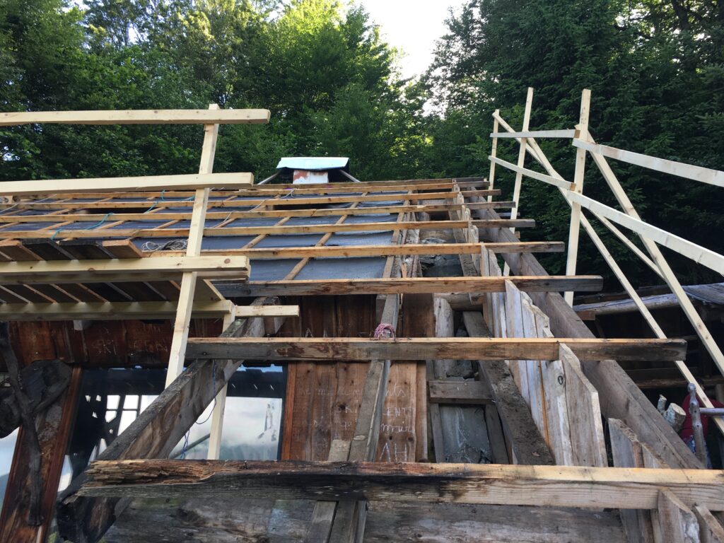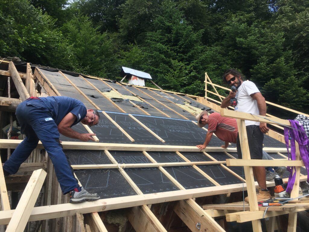 • Démontage de l’ancienne couverture et valorisation des matériaux in-situ (réutilisation ou bois de chauffage pour les plus usagées) ;