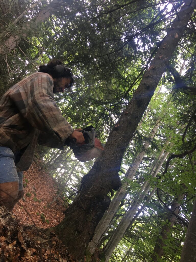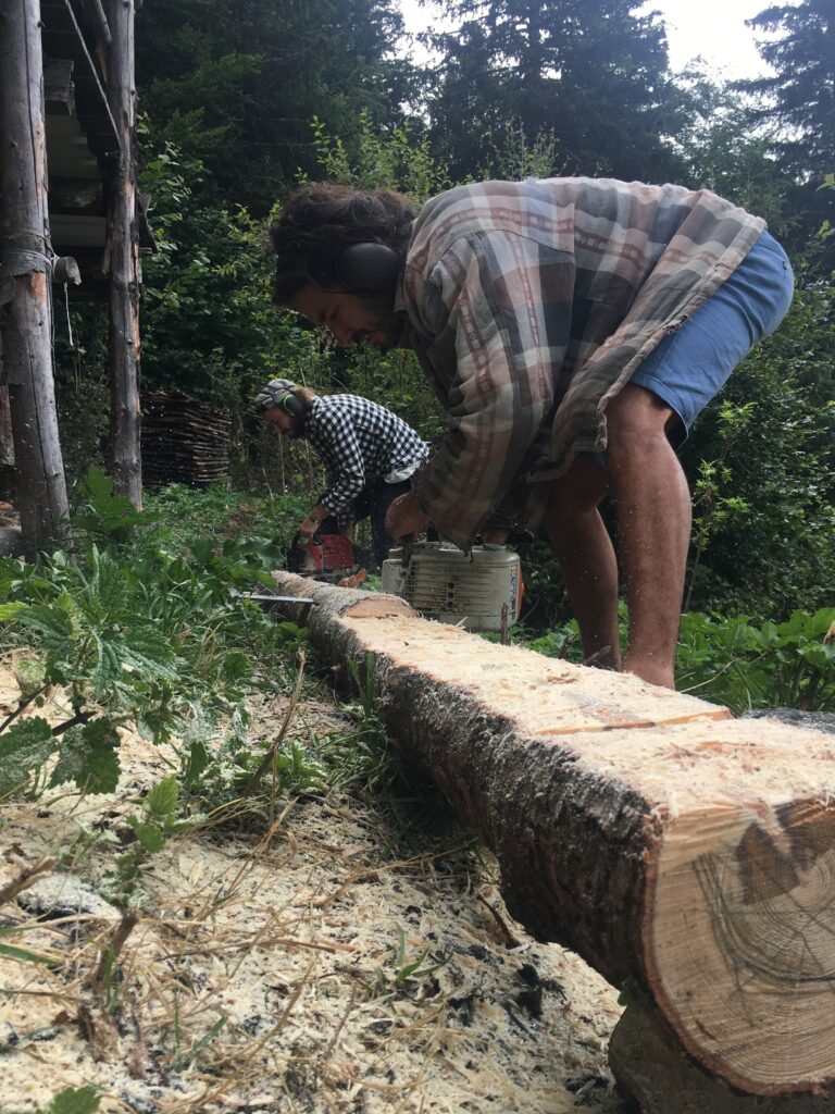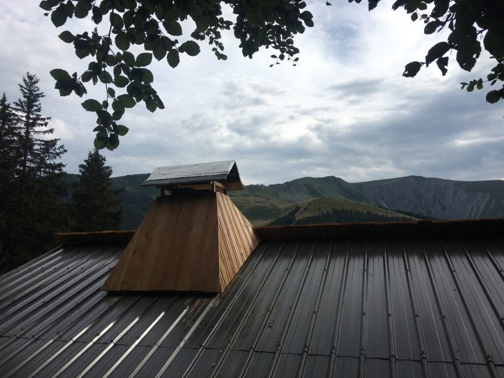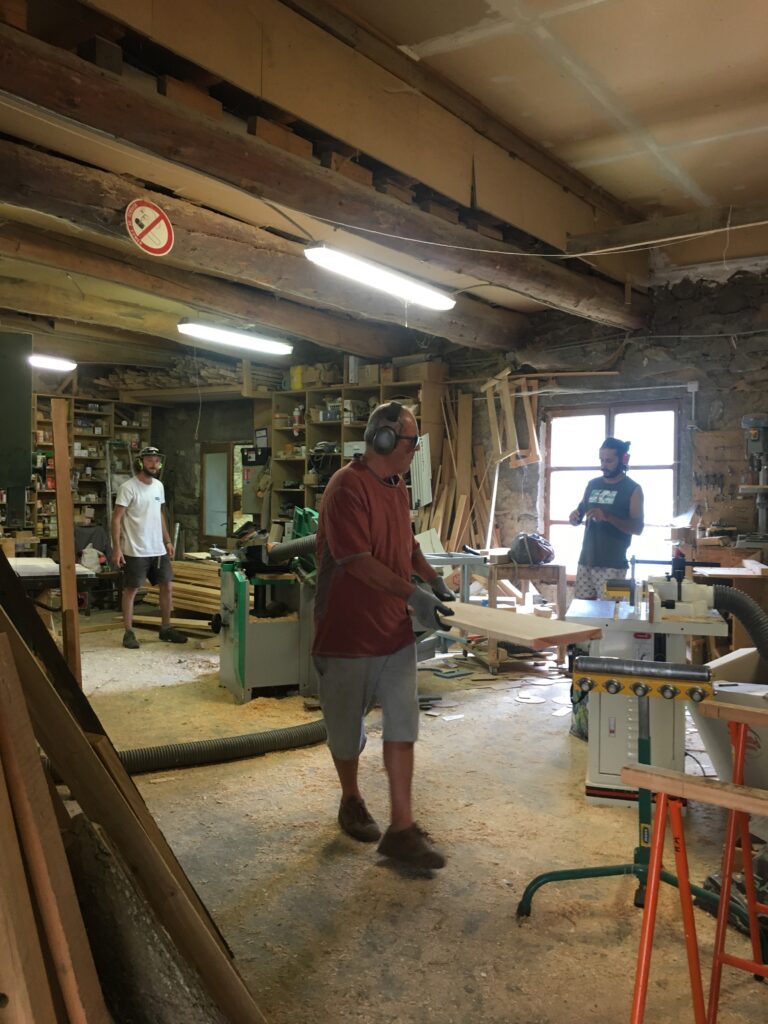 Le bois, coupé et scié localement (à la même altitude que le chalet, mais côté col d’Ornon), a été préparé et livré par une scierie locale de Lavaldens (Patrick Freynet), et usiné dans l’atelier d’Alain Monrozier.
